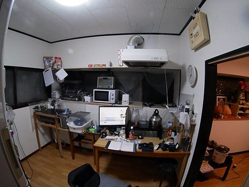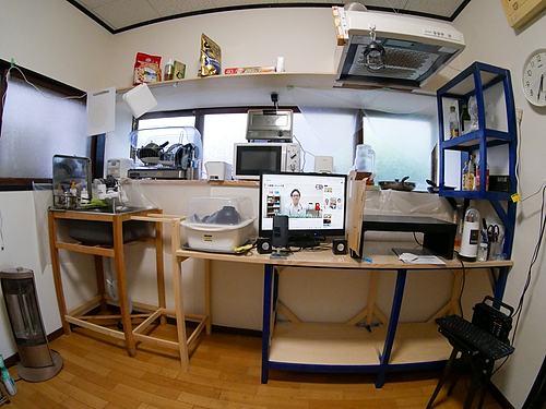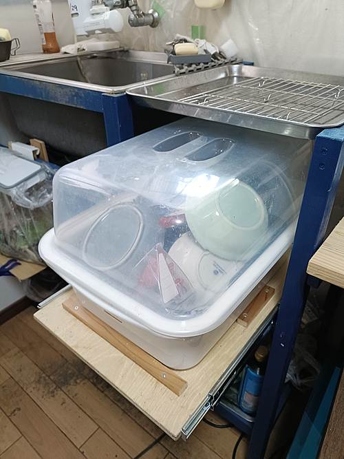完成した画像がありませんが構成としては大体上のようなものです。以前作った左のシンクと今回作ったフレームはつながっていて、実際は下の画像のように食器を入れるプラスチックの入れ物はシンクのすぐ右側にスライドレールの棚で出し入れ出来るようにしています。そしてその上ではまな板を置いて料理が出来るようになっています。普段は一人だけなので食器棚のようなものは特に必要ありません。