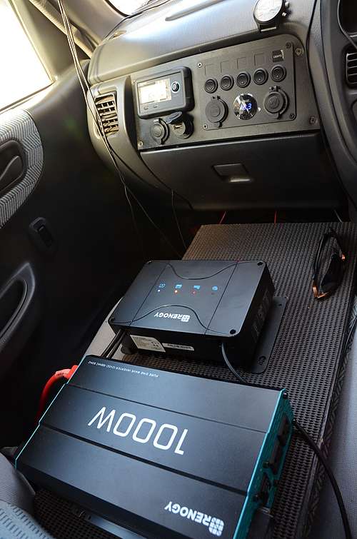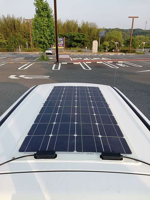 後年ソーラーパネルと走行中に発電したものを車内のリチウムイオン電池にためて使えるようにしました。助手席に機器を置いていますがベットは干渉しませんので設置すればそのまま使えます。