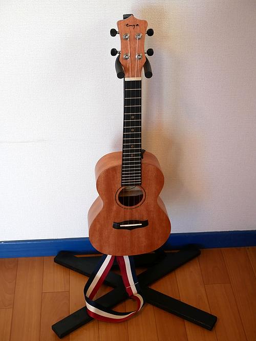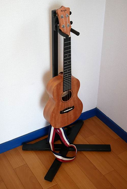 学生寮に住む息子のために作りました。壁にフックを取り付けることが出来なためこのようなスタンドになりました。普通に使えばそう倒れるものではありませんし、どうしてもというのなら脚になにか荷物を載せれば確実に倒れないでしょう。フックと足裏に付ける円筒形の小さなゴムだけ購入して後の材料は端材で作りました。