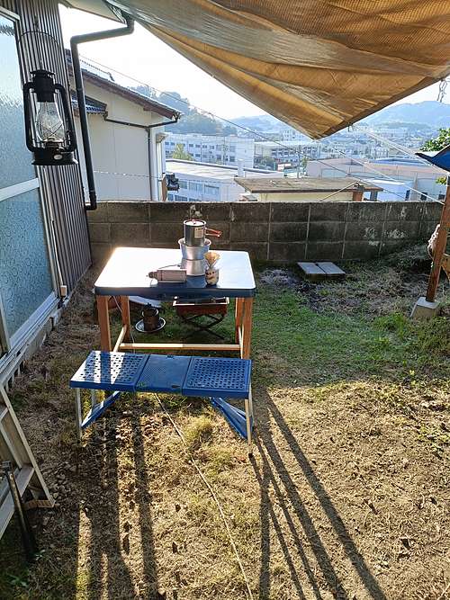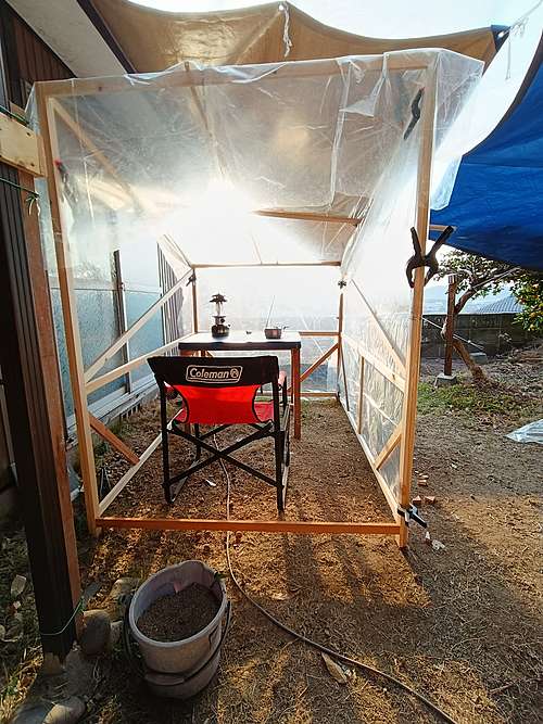 その年の秋先までは単にテーブルを置いていただけでしたが、さすがに冬になるとそのままでは寒いので囲いを作ることにしました。
